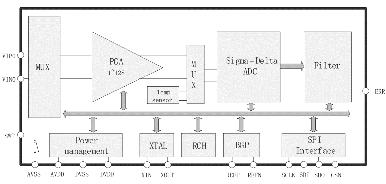 KY5530 为一款 SPI 接口的单通道、32 位高精度 ADC 芯片,内置 1~128 倍可编程的低噪声仪表放大器、高精度 Sigma-Delta ADC,同时内部集成温度传感器、高精度基准电压源、晶体起振电路、高频内部 RC 时钟源。