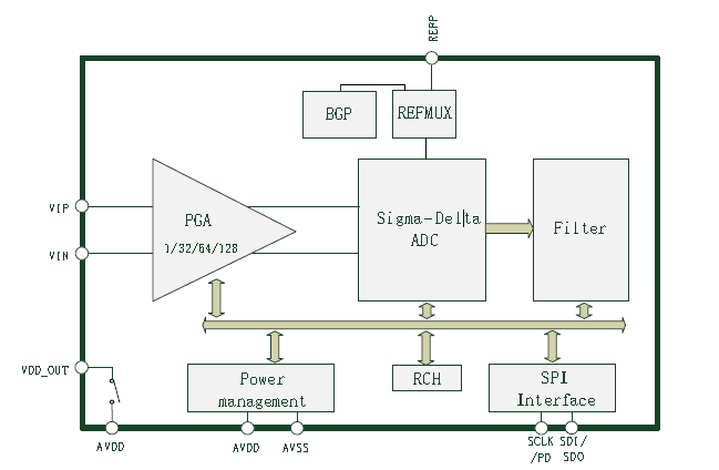 KY5311S 为一款 SPI 接口的单通道、24 位高精度 ADC 芯片,内置 1/32/64/128 倍可编程的低噪声放大器、高精度 Sigma-Delta ADC,高频内部 RC 时钟源和 20ppm 的内部基准源,ADC 实际有效精度(ENOB)为 19.8bit@128 倍 PGA,等效输入噪声低至 16nV/√